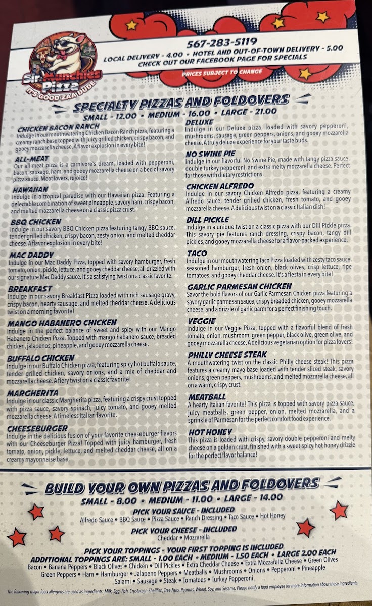At Sirmunchies Pizza - Sandusky, you’ll find a menu full of delicious, freshly made pizzas, each crafted with care and bursting with flavor. Located at 1109 Warren St, Sandusky, OH, this local gem serves up a variety of mouthwatering options that are perfect for any craving. Whether you're in the mood for a classic cheese pizza, a loaded meat lover’s delight, or a veggie-packed masterpiece, there's something here for everyone. With a focus on quality ingredients and a commitment to satisfying every guest, Sirmunchies offers a casual, welcoming vibe that makes it the perfect spot for a relaxed meal with friends or family. You can also customize your pizza to suit your taste, choosing from a range of toppings that make every bite special. So, whether you’re grabbing a quick lunch or enjoying a cozy dinner, the Sirmunchies Pizza - Sandusky Menu has got you covered with some of the best pizza in town.